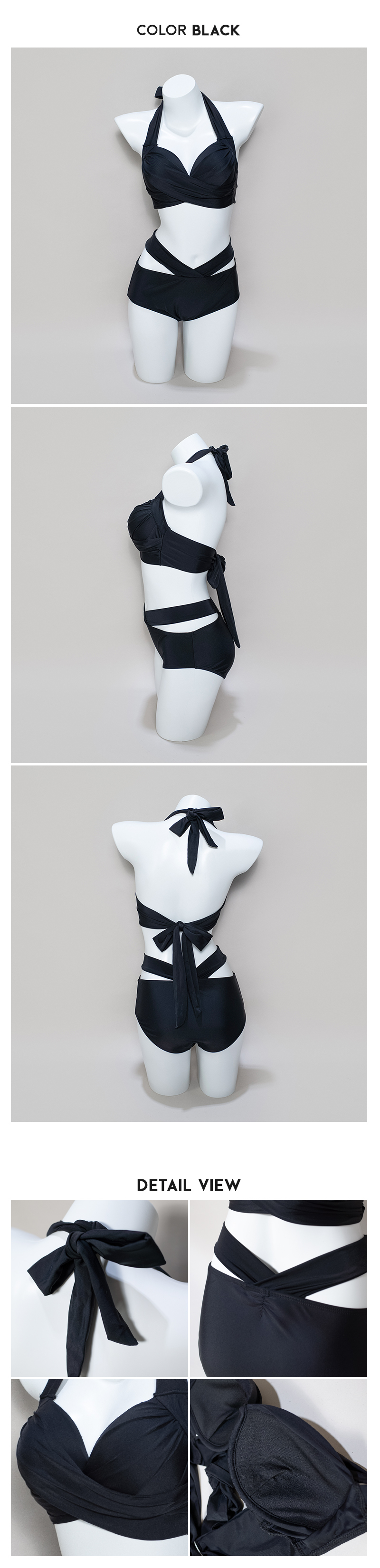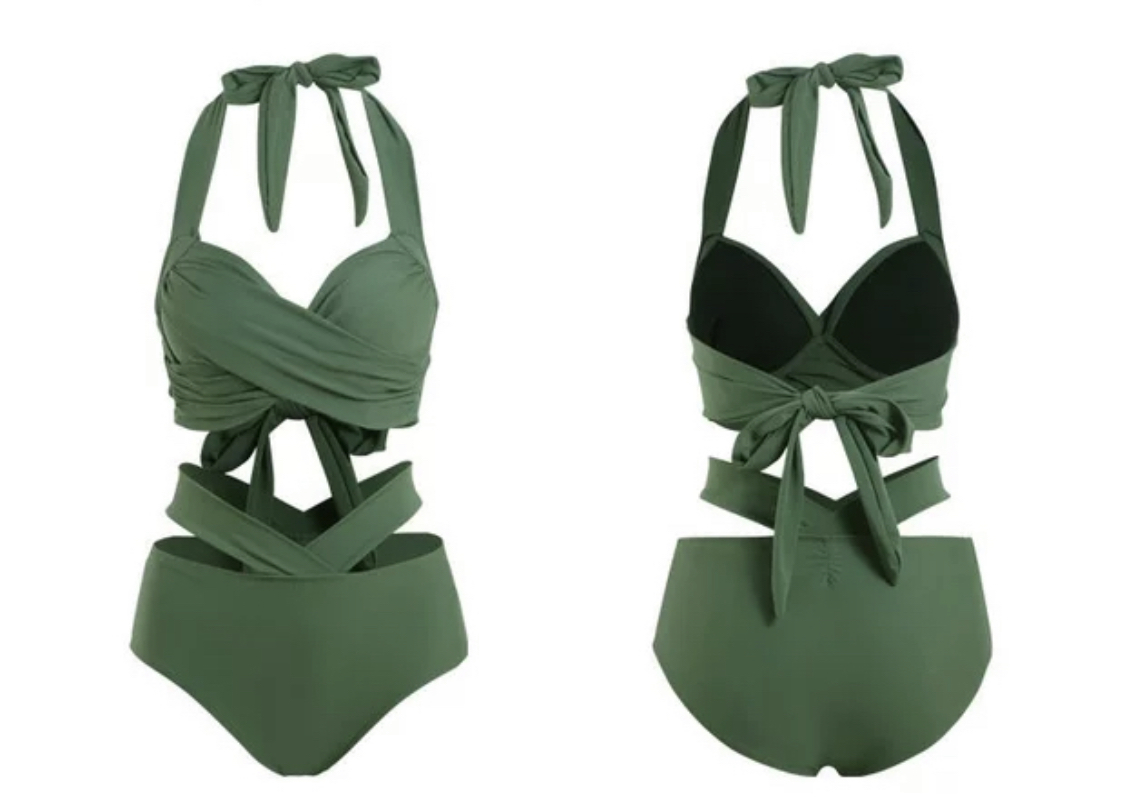 The crisscross strap design is very slimming, and the gathered detail at the chest adds visual fullness. Paired with high-waisted swim bottoms that accentuate the waist.