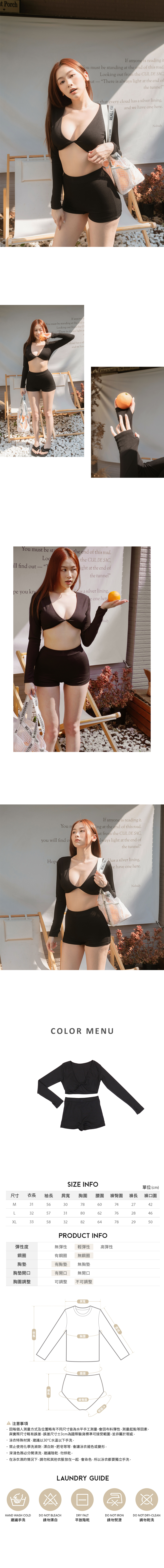 長袖款式保護雙臂及手部免受紫外線傷害。胸口扭結設計小露性感,高腰設計提升腿部比例,修飾身形,游泳或海灘活動中既時尚又實用。