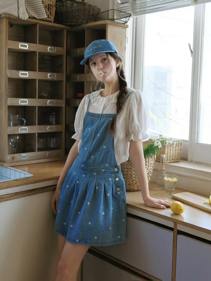 韓國製牛仔小花吊帶短洋裝-KK159