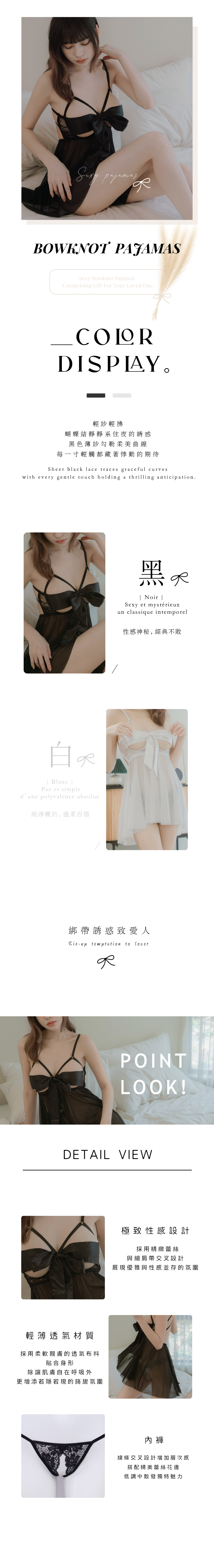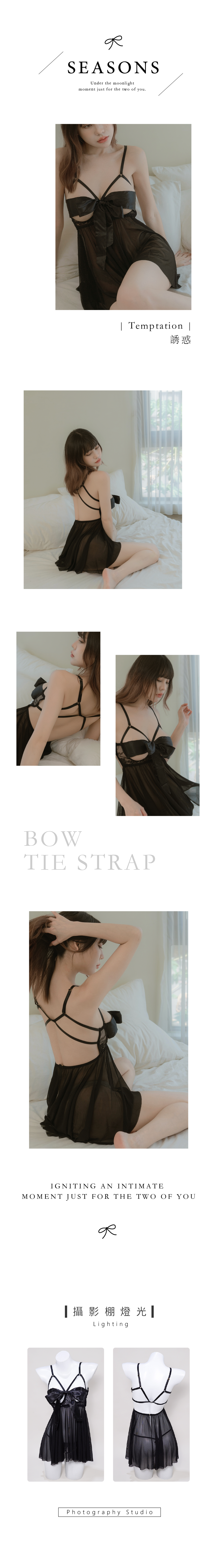 蝴蝶結綁帶設計,穿起來非常性感,柔軟蕾絲拼接薄紗,肩帶可調,附內褲